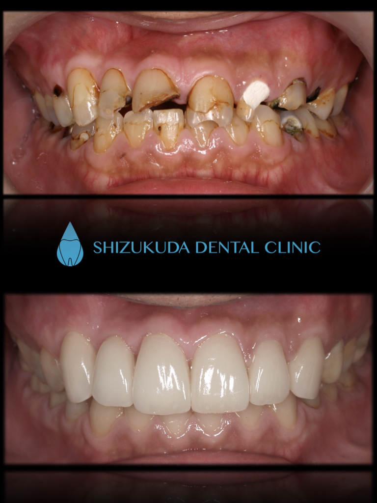 | 治療方法 | 食生活、生活習慣の乱れからの虫歯による咬合崩壊症例 全体的な歯周治療、プラスチックの治療用の歯による咬合治療後、コンポジットレジンとセラミックによる咬合再構成。 咬合治療とはお口の中をひとつの単位と捉え、咬み合わせや審美性、顎関節などをトータルに治療していきます。口腔内の崩壊をきたしてしまった患者さんに対して、悪くなってしまった原因を追求し、次は悪くならないように、機能面、清掃性、審美性のトータル治療が「全顎治療(フルマウスリコンストラクション)」です。虫歯や歯周病になってしまった歯を1本だけ治すのではなく、お口全体を考慮して長期的な視野に立った健康維持を行うために治療計画を立てていきます。 劇的なスマイルの改善、食生活も見直していただき肌つやも良くなりお顔の印象が大きく変化しました。公私ともに周囲の評価も上がったと非常に喜んでいただきました。 虫歯だから詰めて終わるのではなく、なぜ虫歯になったのかを追求し歯科治療にあたりました。 |